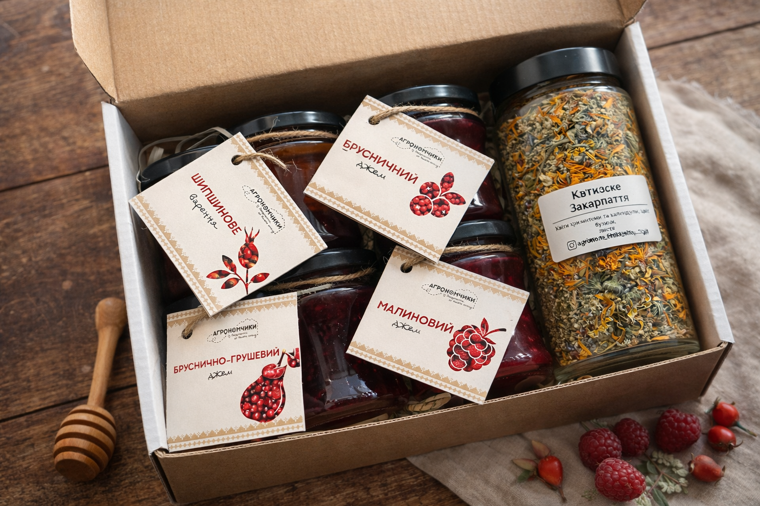 Цей набір — маленька гастрономічна подорож у Закарпаття. У коробці зібрані натуральні крафтові джеми та ароматний трав’яний чай, створені з ягід, плодів і рослин, які ми вирощуємо або збираємо в горах нашого краю.